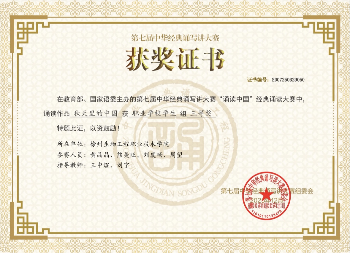 近日,由教育部、国家语委主办的第七届中华经典诵写讲大赛“诵读中国”经典诵读大赛全国获奖名单正式公布。我校师生在本次赛事中脱颖而出,斩获两项国家级荣誉——刘宁老师诵读作品《雪》荣获教师组二等奖,学生黄晶晶、熊美旺、刘虞畅、周望合作诵读作品《秋天里的中国》荣获职业学校学生组三等奖,以声音为媒介传承中华经典,用专业实力彰显文化自信。